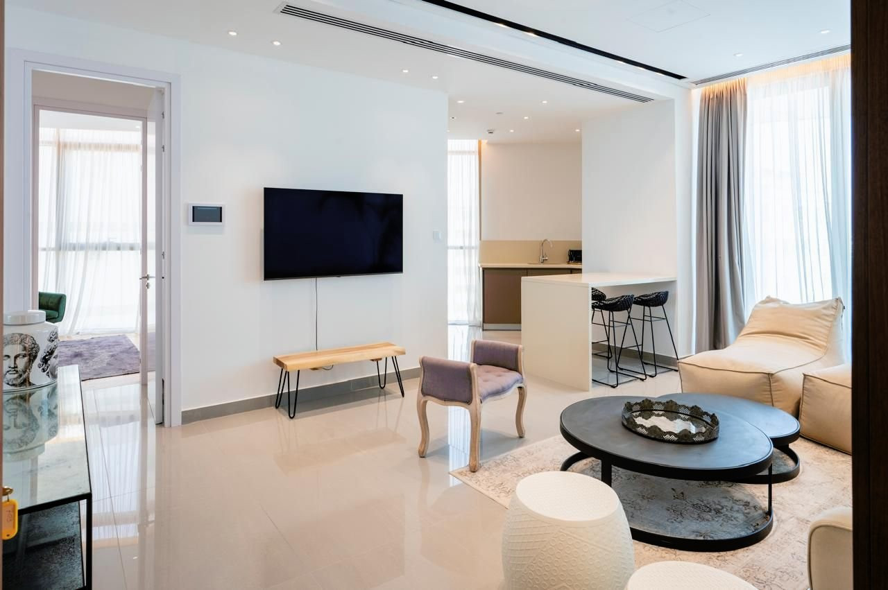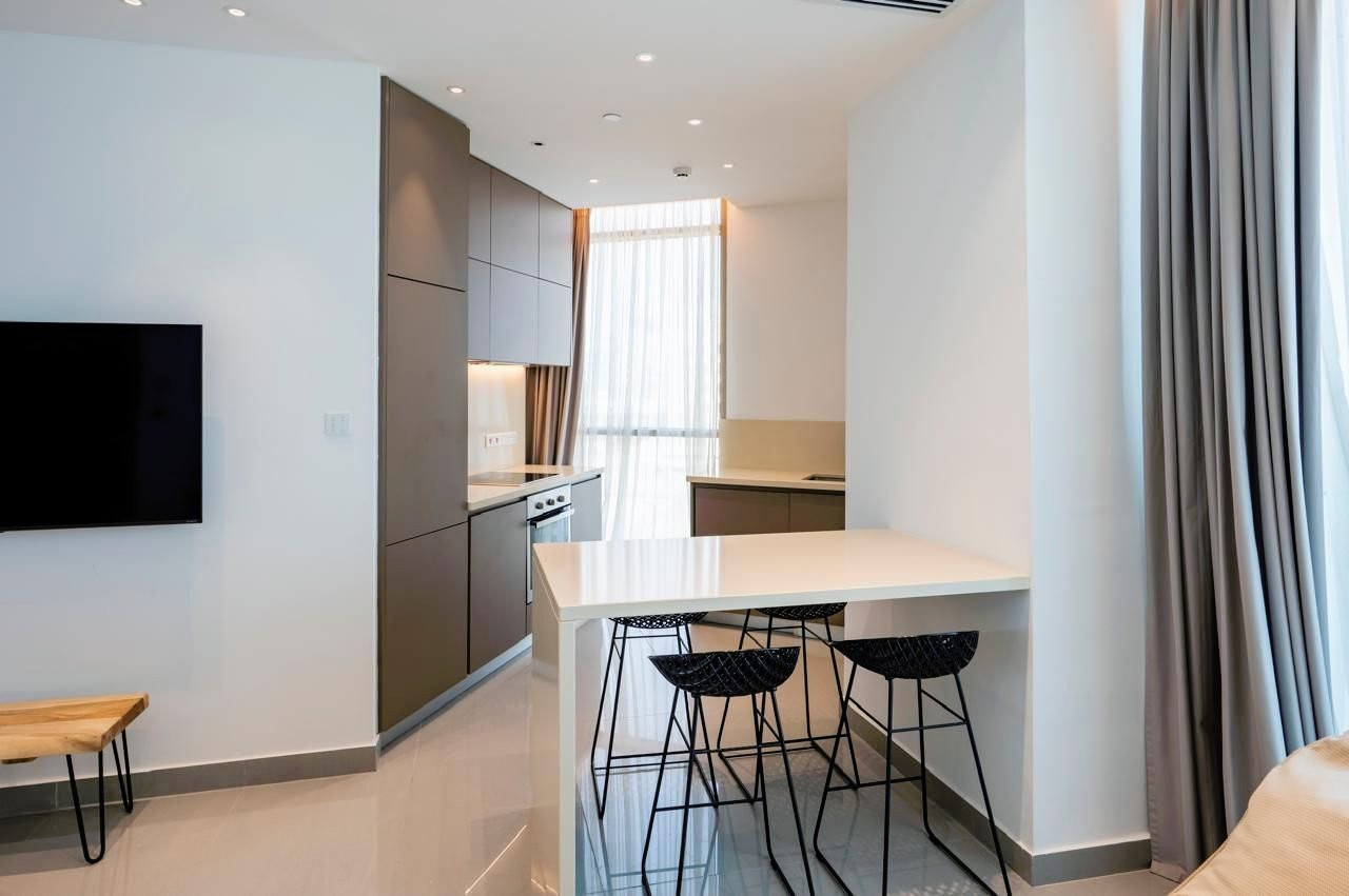Massive one bedroom apartment available for rent in the heart of Nicosia's city center. The property is offered fully equipped and furnished and it consists of an open plan living room with dining area and a fully fitted kitchen opening to the covered veranda, a very spacious bedroom and a bathroom. The property benefits of concierge services, private pool and gym for the residences and many more. Common expenses and internet are included.