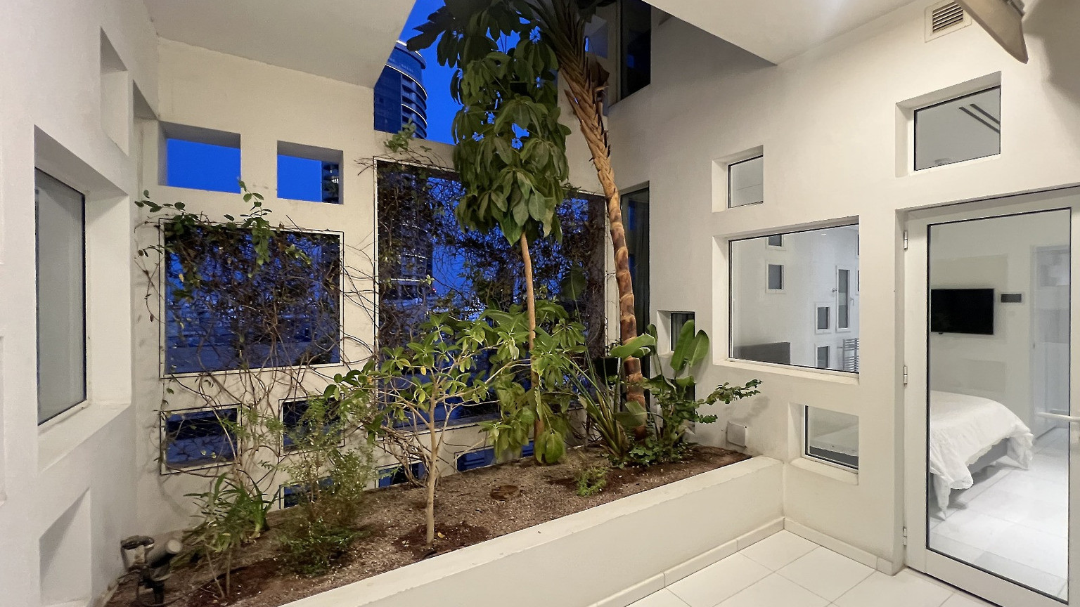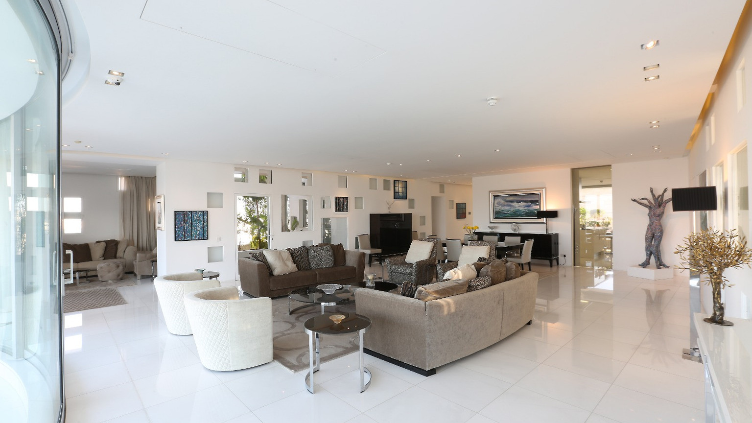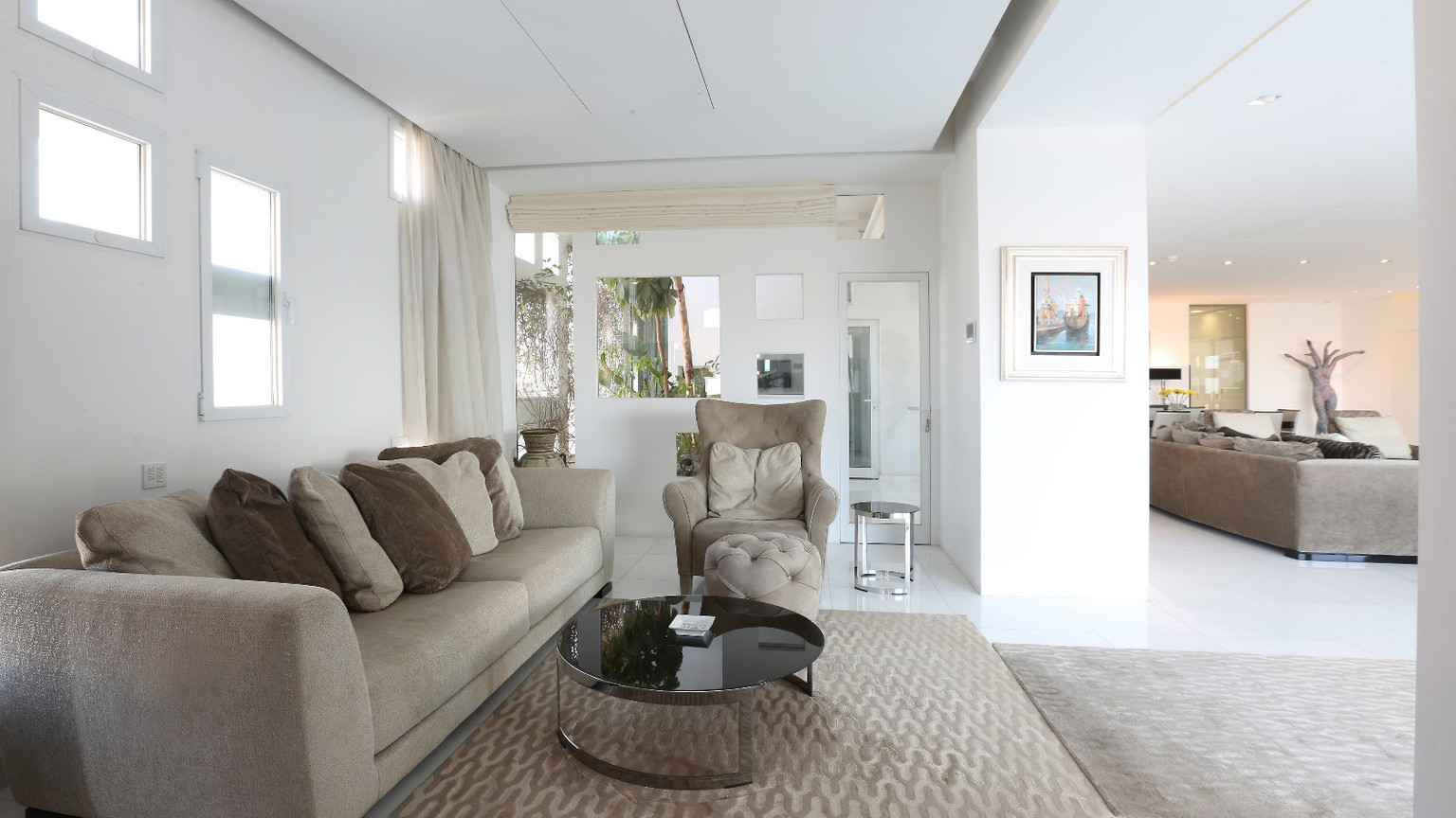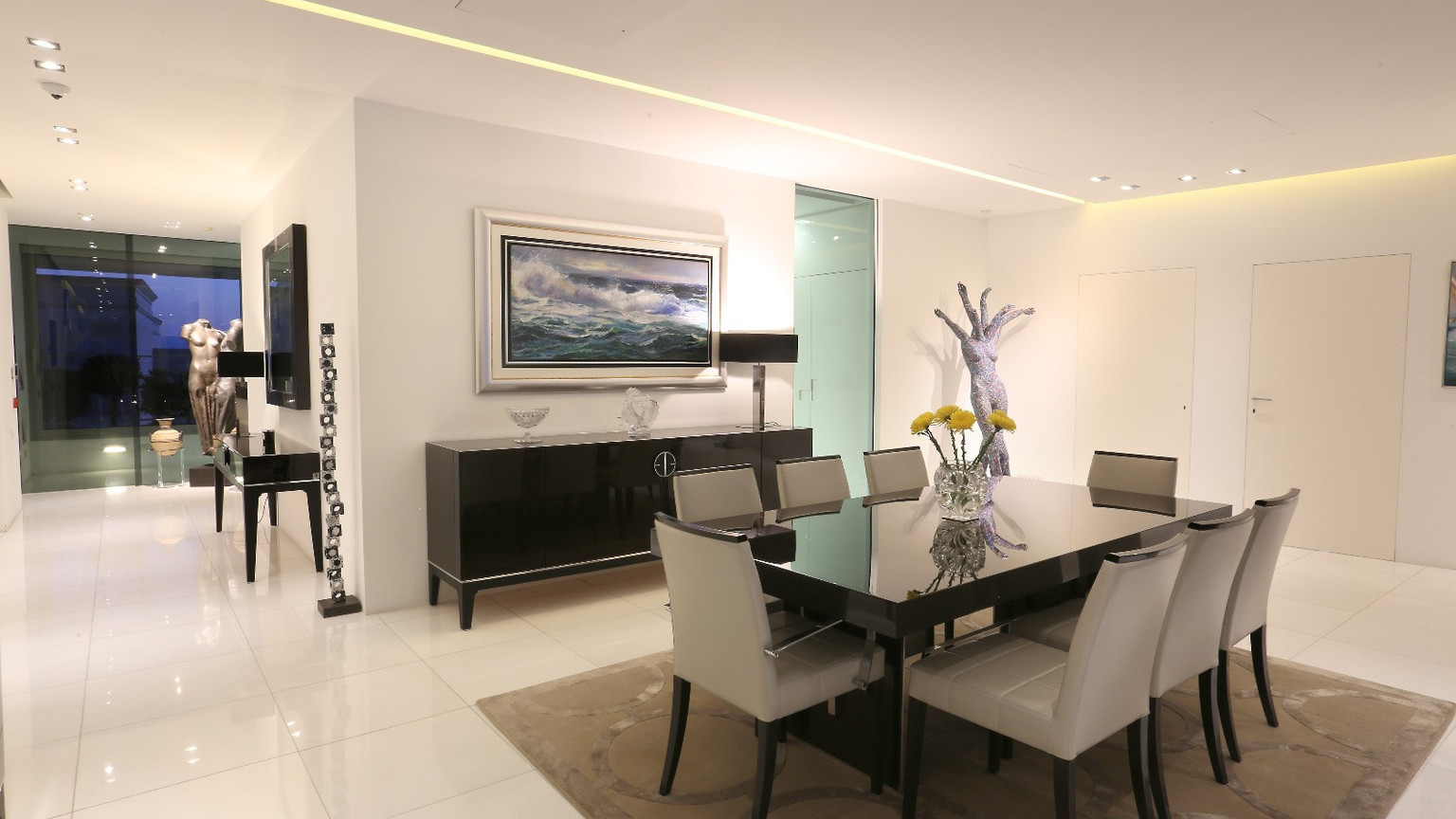 The private wing features a corner master suite with an en-suite bathroom and walk-in dressing room, the property accommodates two additional bedrooms and two more luxury bathrooms. A glass-lined office overlooks an internal courtyard, leading to a private loggia that bathes the space in natural light.