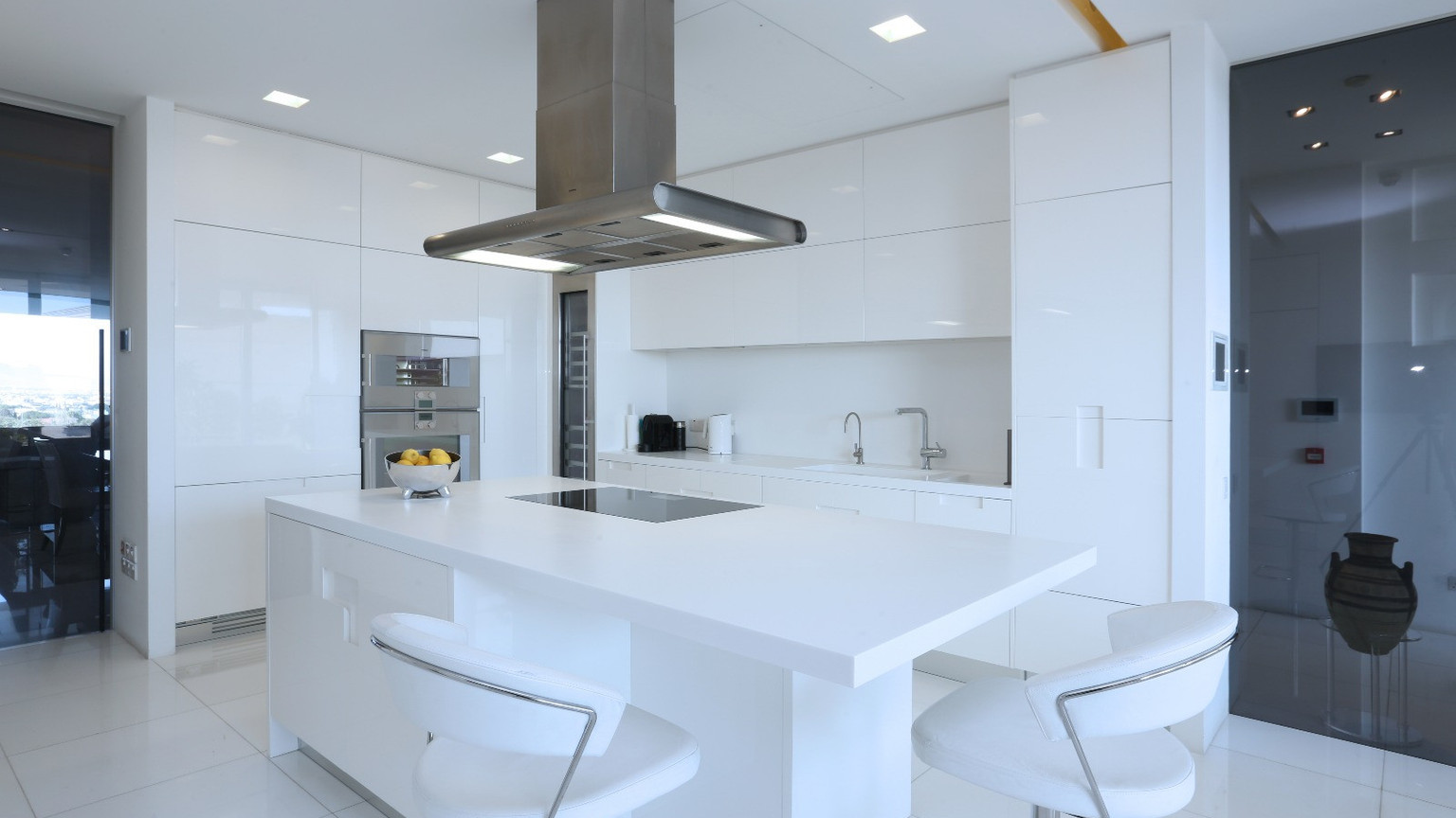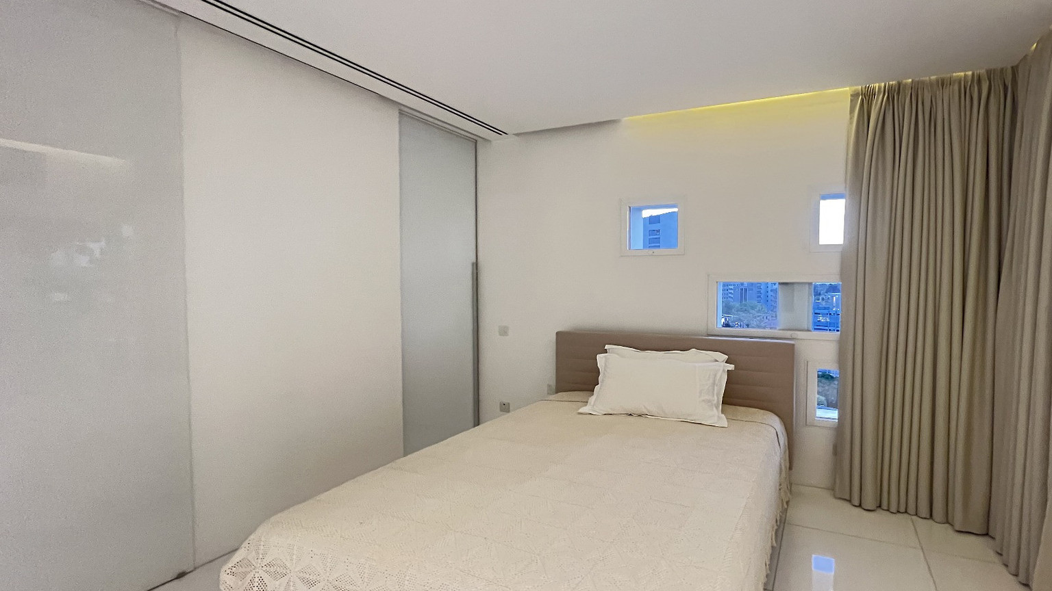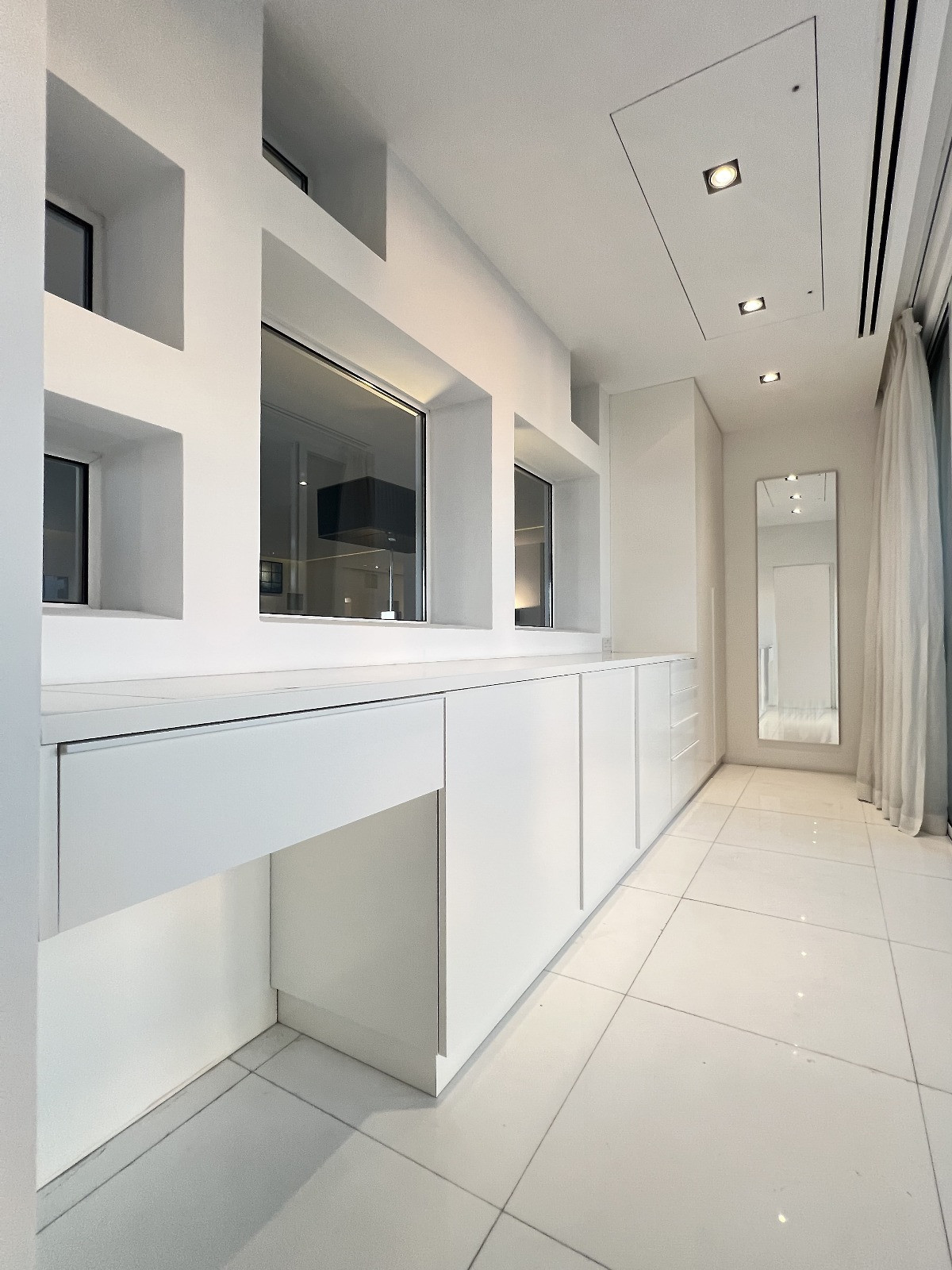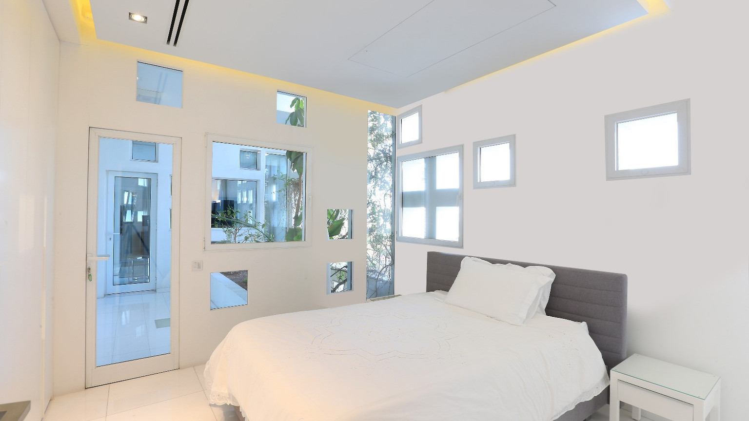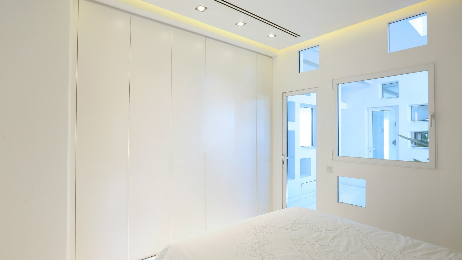 The private wing features a corner master suite with an en-suite bathroom and walk-in dressing room, the property accommodates two additional bedrooms and two more luxury bathrooms. A glass-lined office overlooks an internal courtyard, leading to a private loggia that bathes the space in natural light.