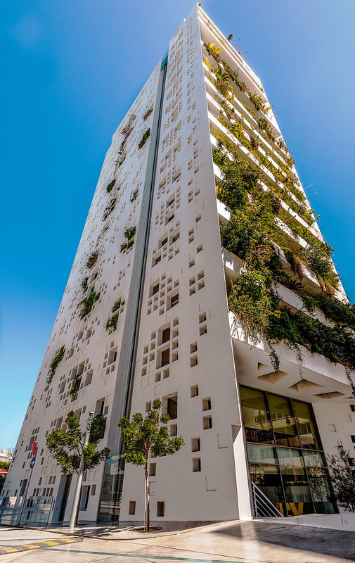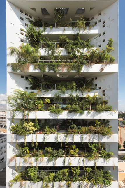 The open-plan interior seamlessly connects lounge areas, a dining zone, and a contemporary kitchen with a large island. These spaces effortlessly extend to wraparound terraces, designed for quintessential Mediterranean entertaining. The living façade, adorned with lush climbing plants, provides natural cooling and enhances the building’s striking presence.