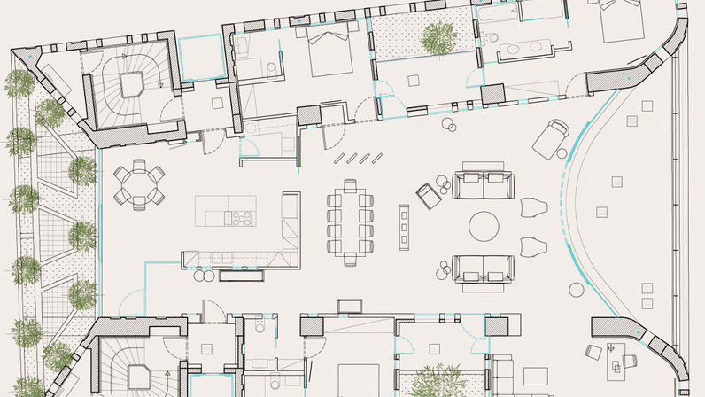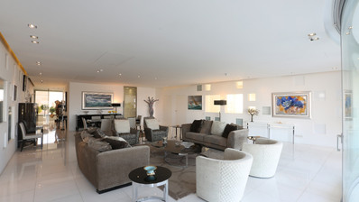 The private wing features a corner master suite with an en-suite bathroom and walk-in dressing room, the property accommodates two additional bedrooms and two more luxury bathrooms. A glass-lined office overlooks an internal courtyard, leading to a private loggia that bathes the space in natural light.